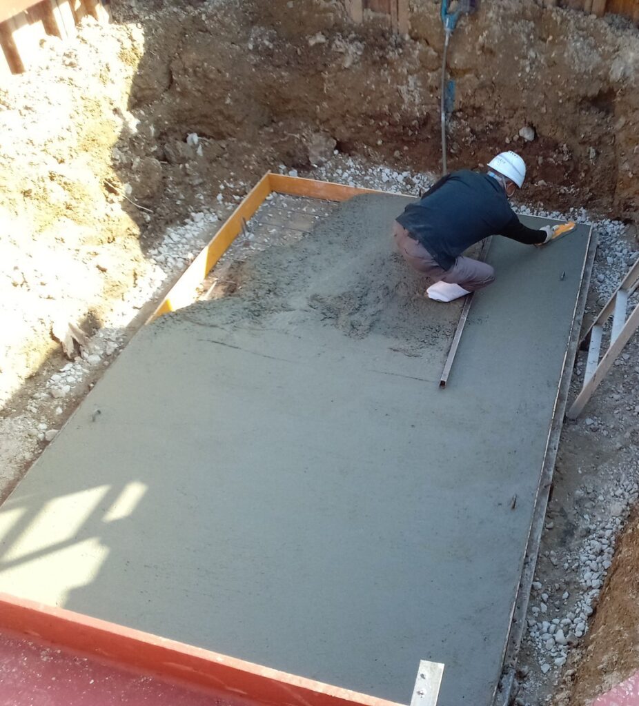 流し込んだコンクリートは、バイブレーター棒で空気を抜きながら均一に整え、最後にコテで滑らかに仕上げます